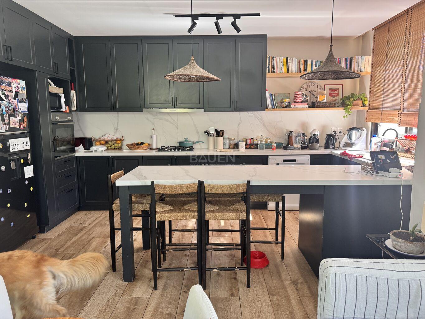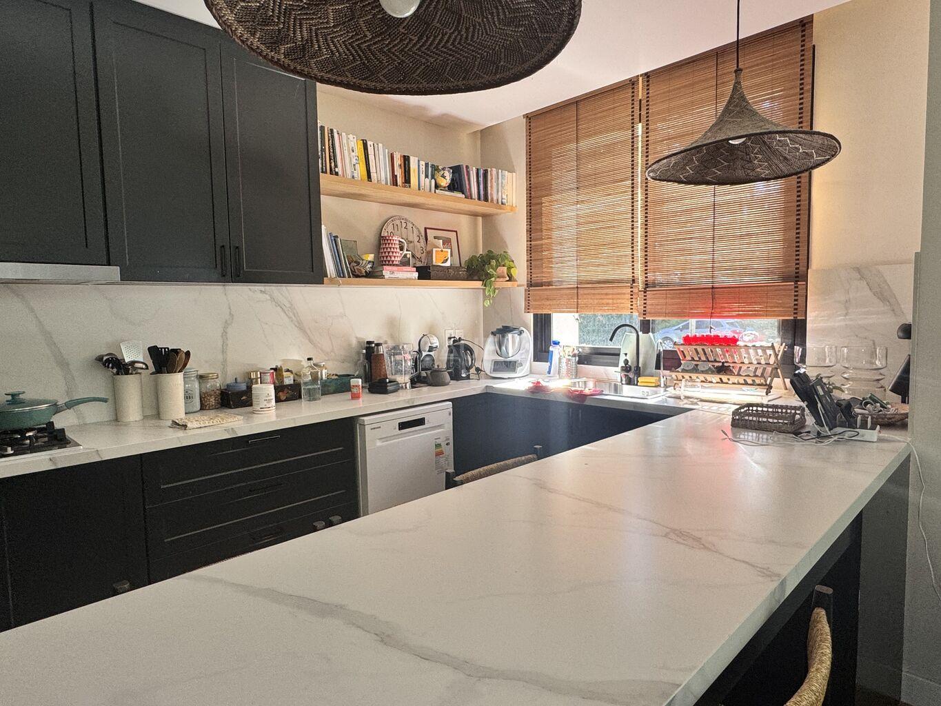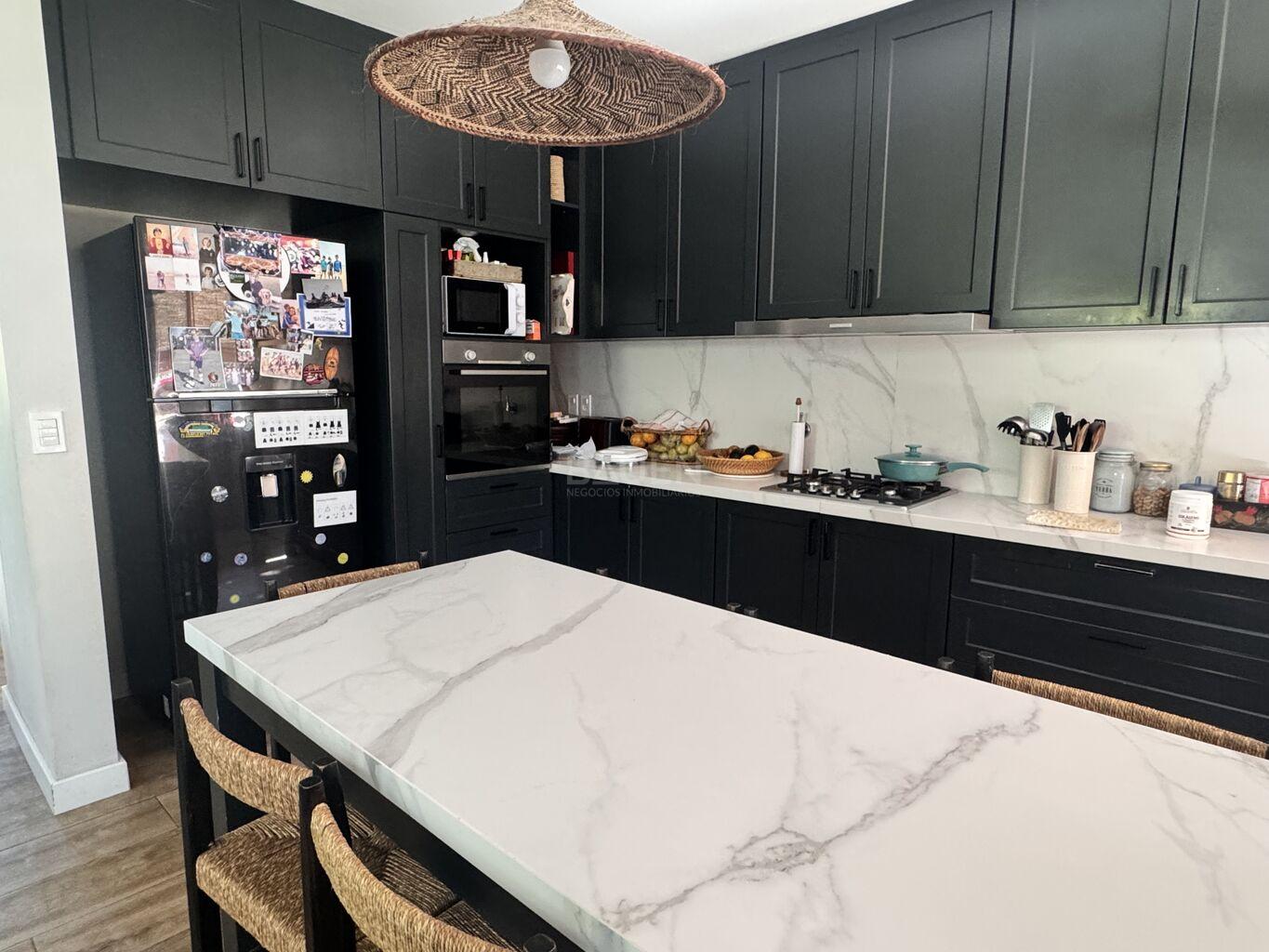 Cocina con mucho lugar de almacenamiento integrado al estar diario al frente.